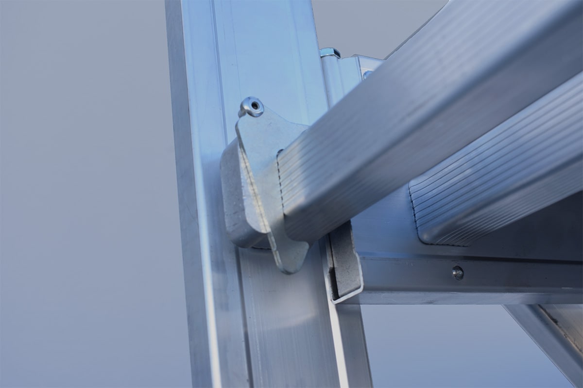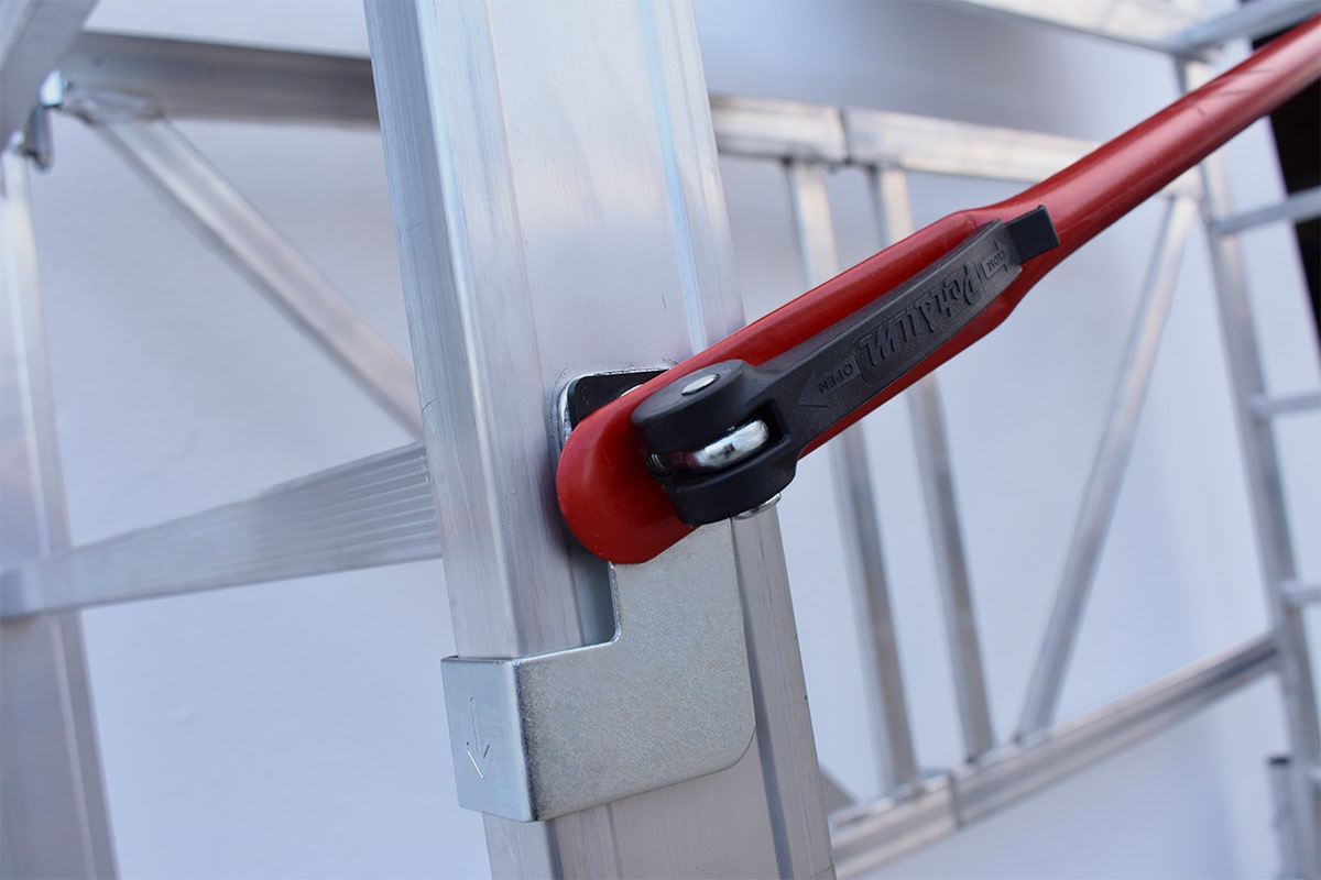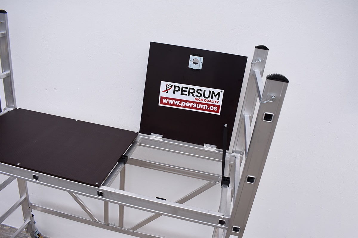 Fabricado con un perfil de 75×1,3 mm. Las crucetas de acero, equipadas con el sistema Q-Lock de seguridad y un rodapié de madera, aseguran una estructura resistente y estable. La plataforma de madera Plywood de 60×155 cm, con acabado antideslizante, proporcionan una superficie sólida y segura para trabajar.