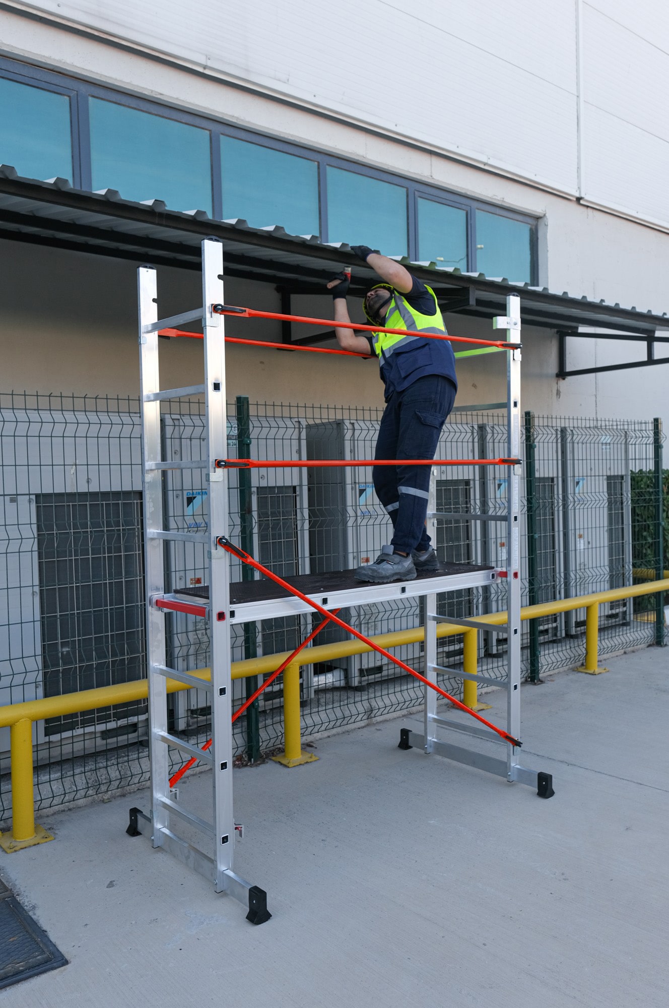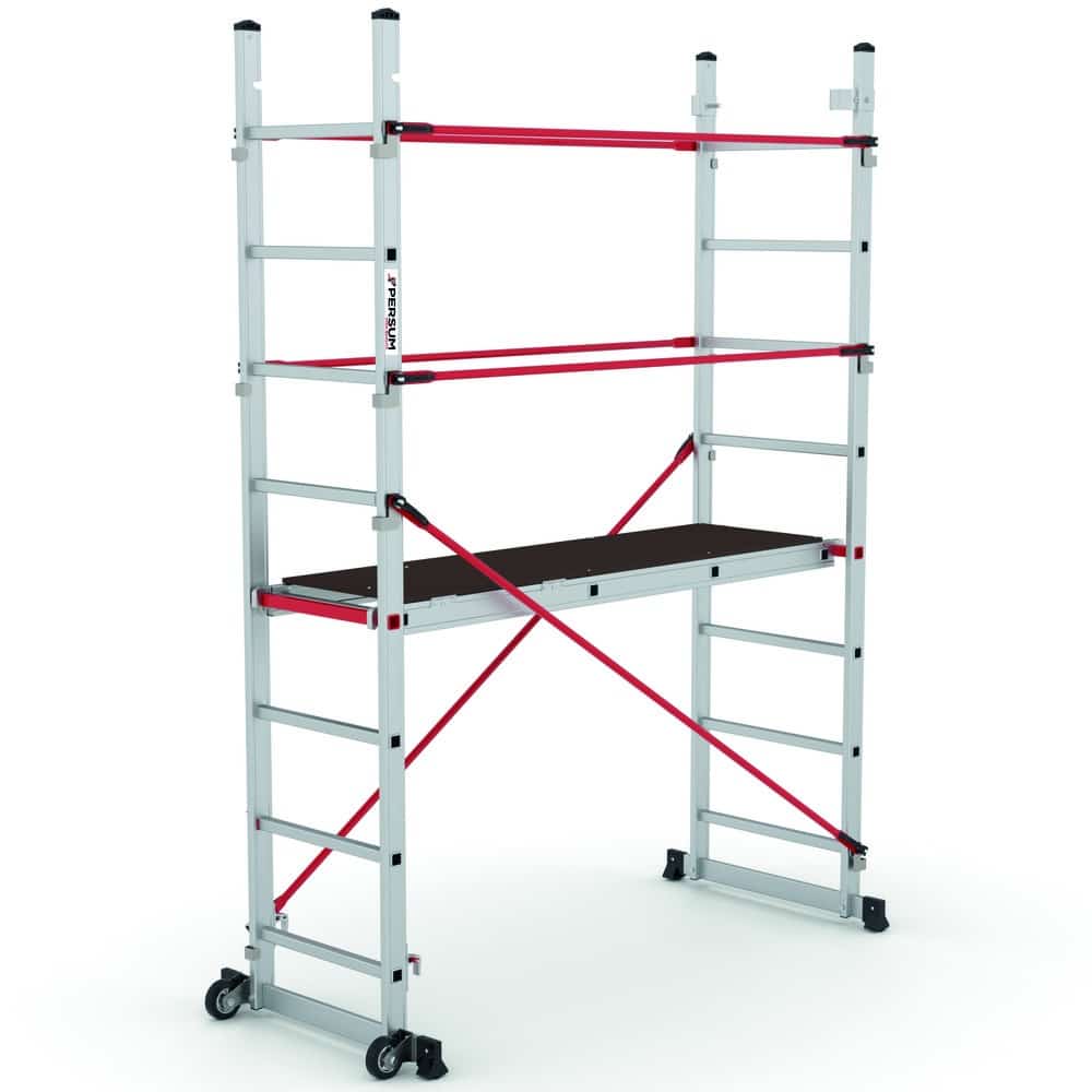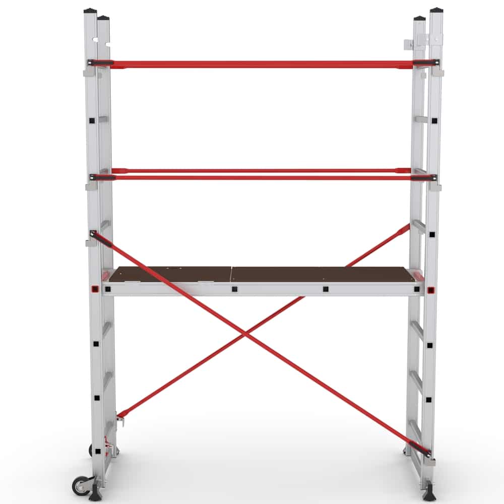 El andamio Tyrion es una opción confiable y versátil para profesionales que necesitan realizar trabajos en altura. Este producto alcanza una altura de trabajo de 3,11 m, se transforma en una escalera, con la cual puedes alcanzar una altura de trabajo de hasta 4.61 m.