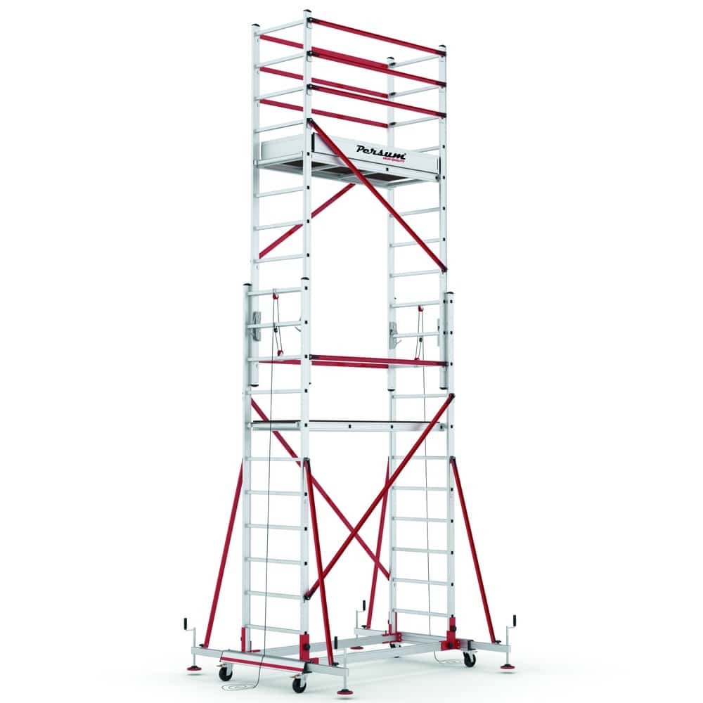 El mecanismo de sistema de poleas permite regular la subida y bajada del andamio de forma fácil y segura, brindando una mayor versatilidad en su uso. Además, el andamio Teletower telescópico se pliega fácilmente para un óptimo transporte y almacenamiento.