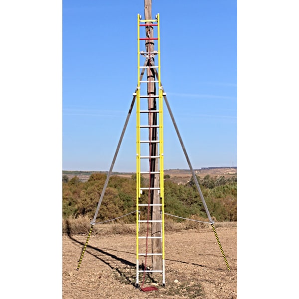 Para los trabajos en postes de madera, especialmente aquellos que puedan estar en malas condiciones, se recomienda estabilizar la escalera utilizando las patas de ganchos, que se anclan de forma segura en el tercer peldaño cilíndrico de la escalera. Esta opción ofrece una excelente estabilidad y asegura que la escalera se mantenga firmemente en su lugar durante el trabajo.