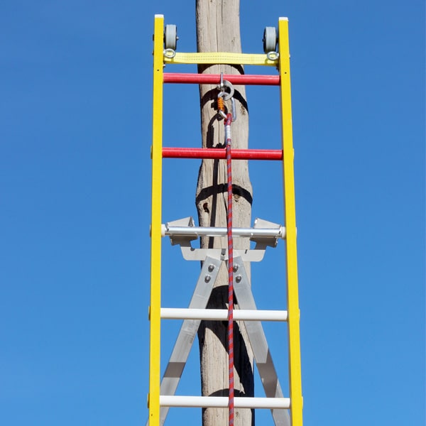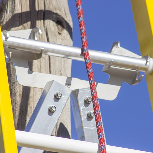 En el caso de los postes de hormigón, no es necesario el uso de patas estabilizadoras adicionales. La Volta Safe Pro está equipada con los elementos necesarios para un correcto anclaje al poste, incluyendo mordazas, cáncamos y cuerda de atado, lo que garantiza un ajuste seguro y fiable para trabajos en estos entornos.