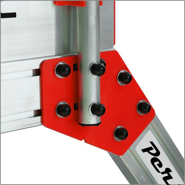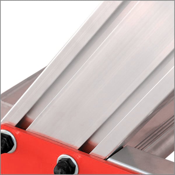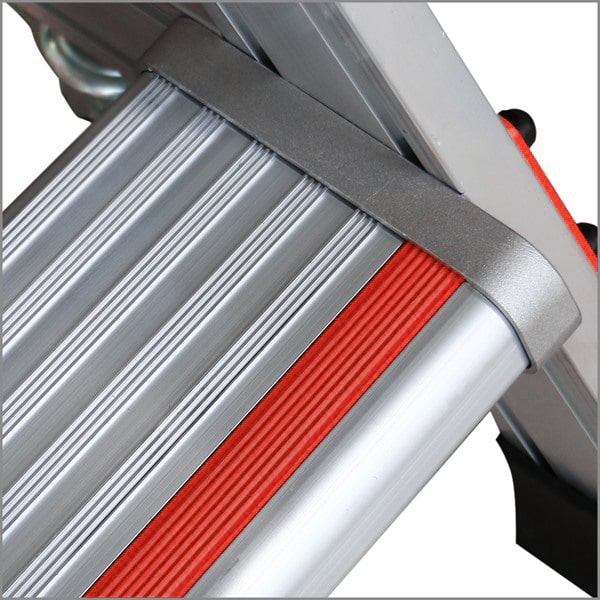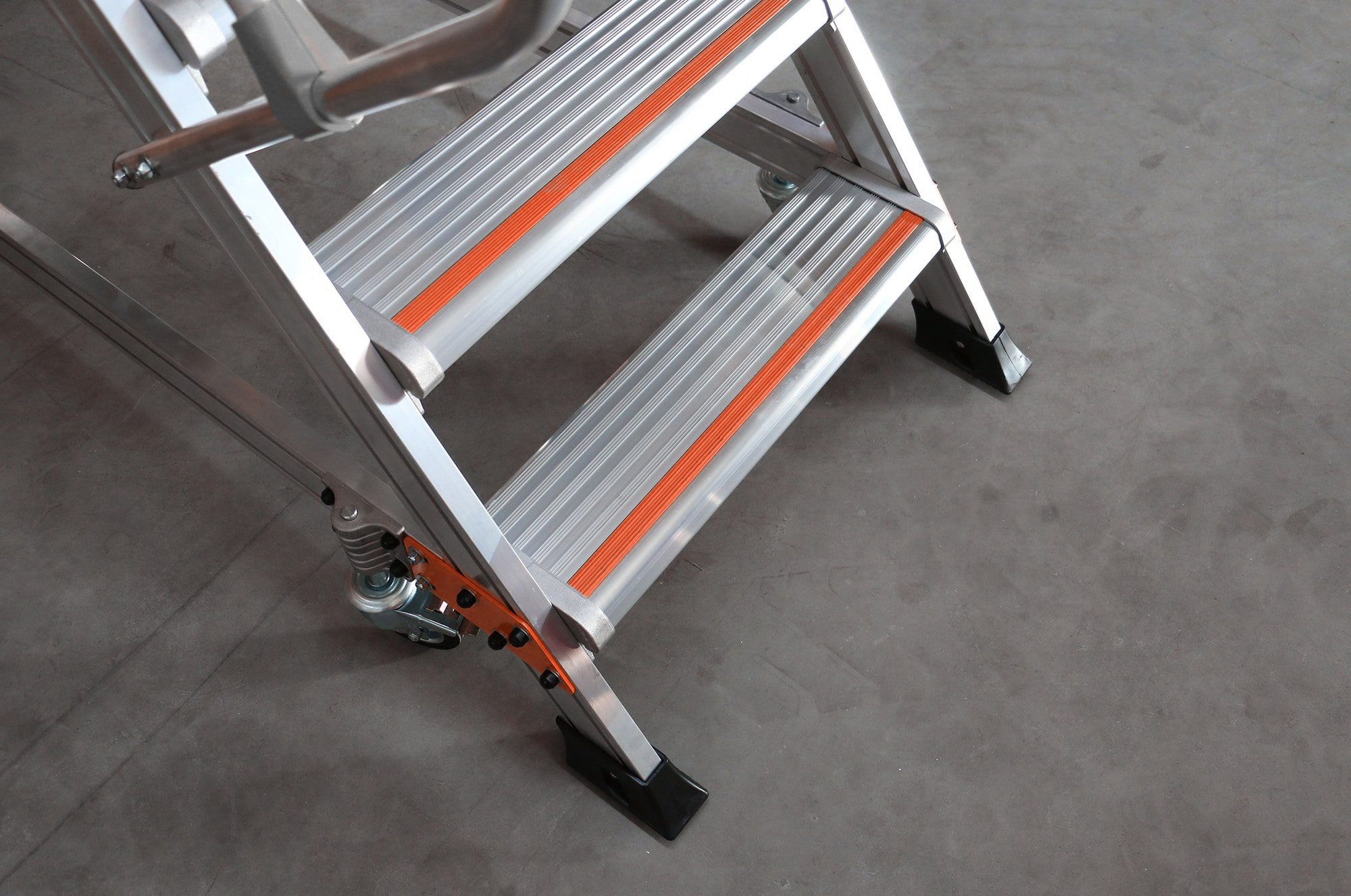 Los peldaños amplios antideslizantes de 18 cm de ancho, con línea roja reflectante de seguridad, brindan una superficie de apoyo segura y visible, incluso en condiciones de baja visibilidad. Los tacos de goma blanda antideslizante mejoran aún más la estabilidad y evitan deslizamientos no deseados, brindando una base segura en cada tarea.
