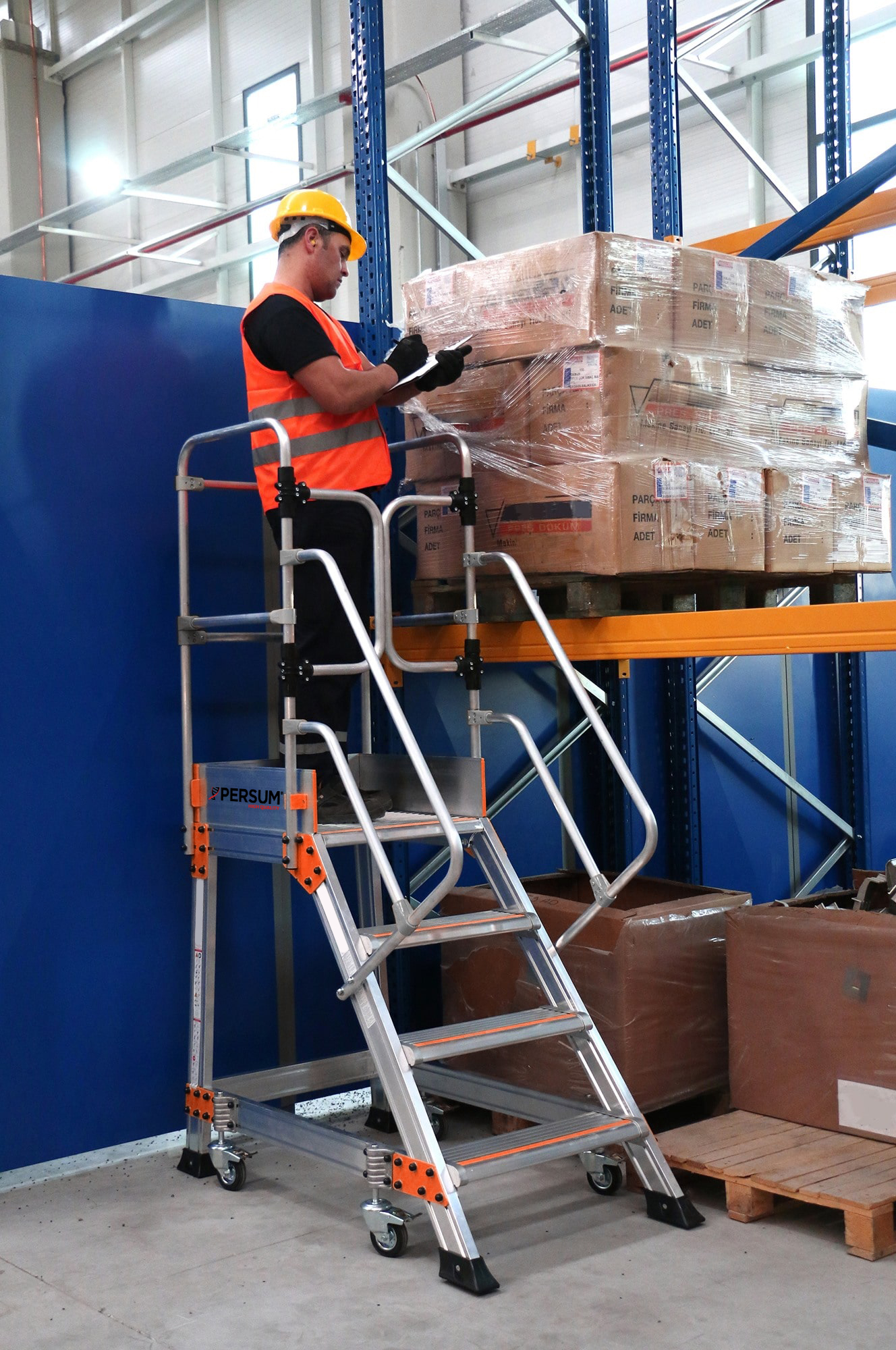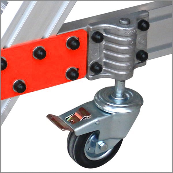 Equipada con puertas abatibles Safe Return. La plataforma de trabajo de 60 x 61 cm proporciona el espacio necesario para llevar a cabo las tareas de manera cómoda y eficiente en 360º. Además, las ruedas escamoteables con freno facilitan el transporte y la movilidad, asegurando la estabilidad durante su uso.