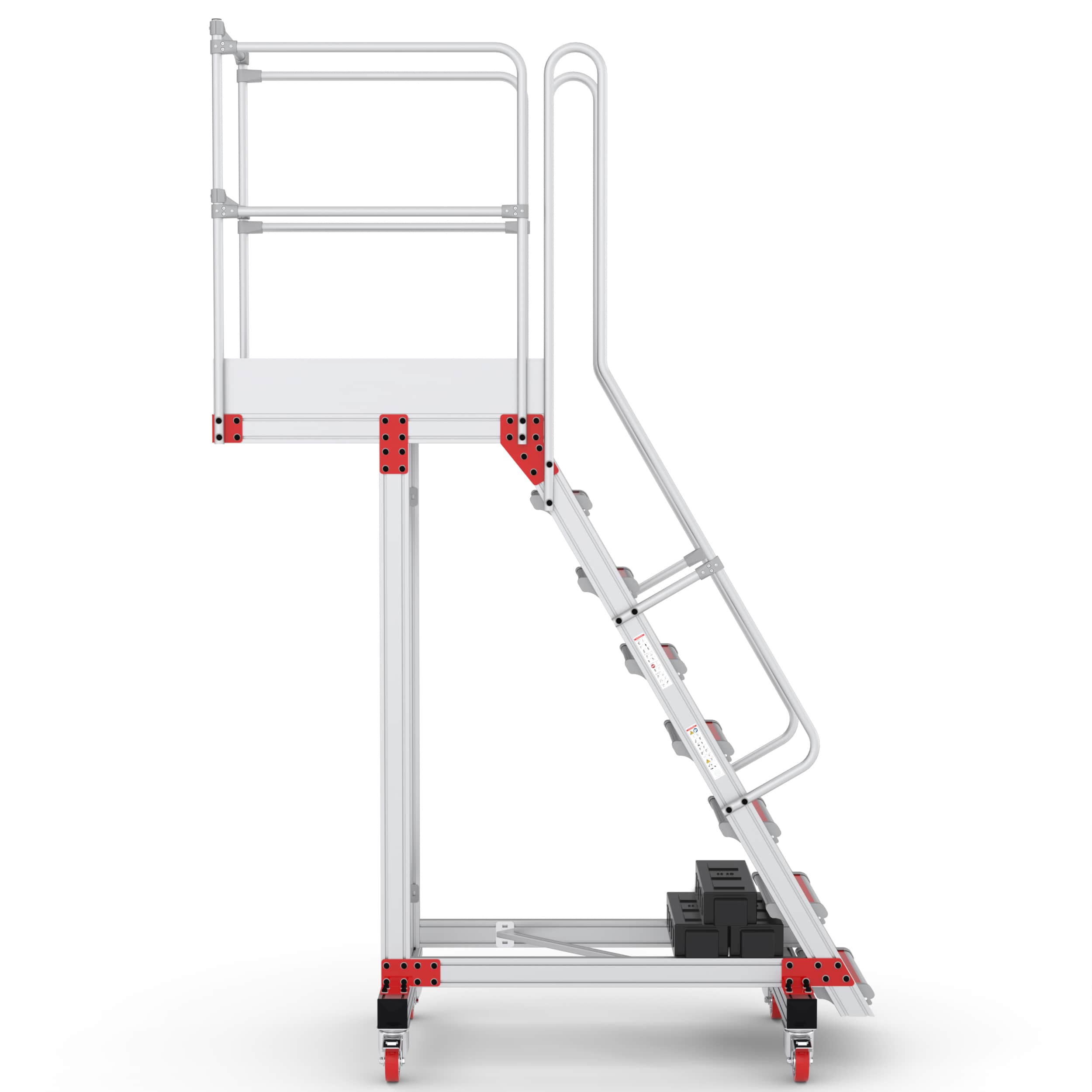 La plataforma de trabajo de 60 x 100 cm proporciona el espacio necesario para llevar a cabo las tareas de manera cómoda y eficiente. Los peldaños amplios antideslizantes de 18 cm de ancho brindan una superficie de apoyo segura y visible, incluso en condiciones de baja visibilidad.