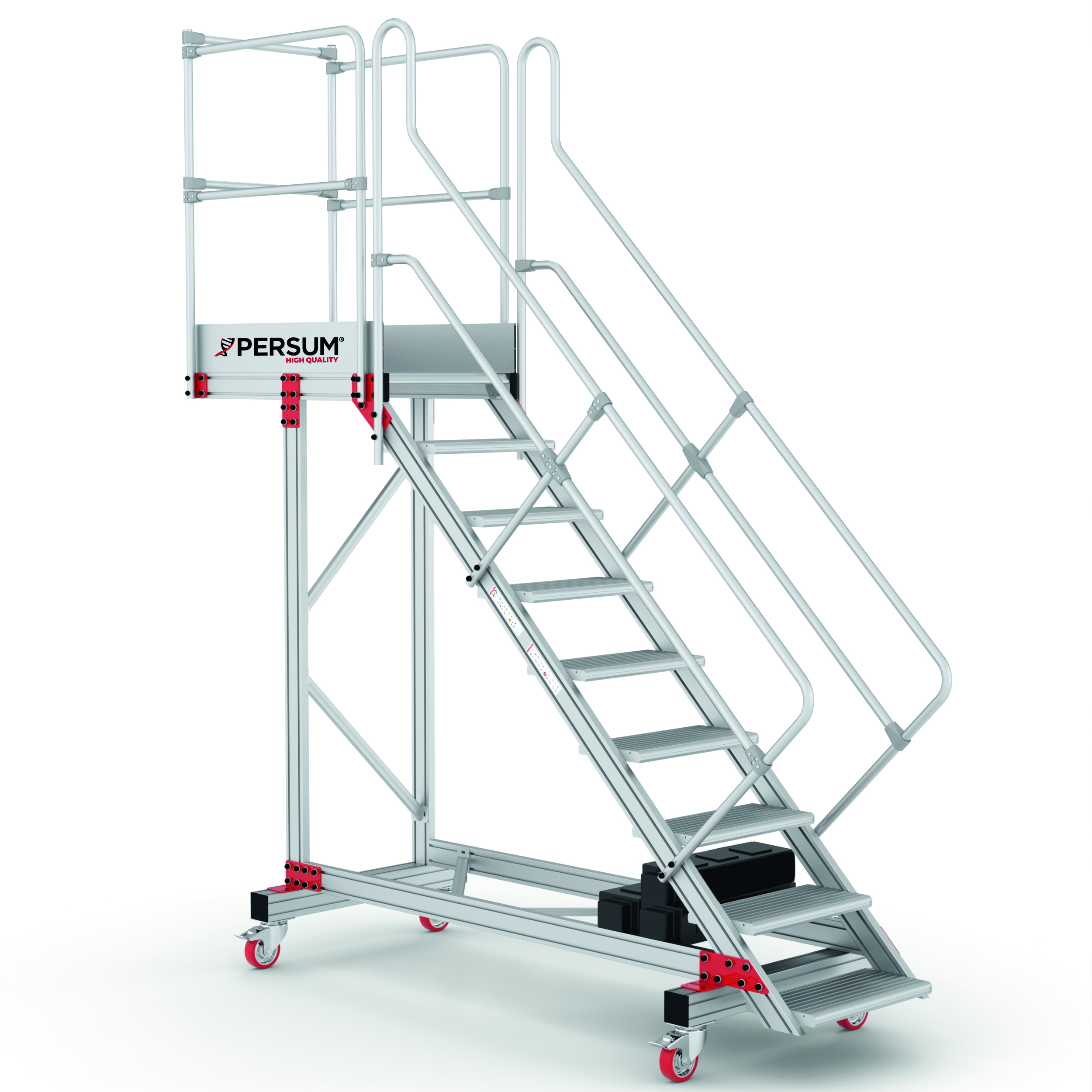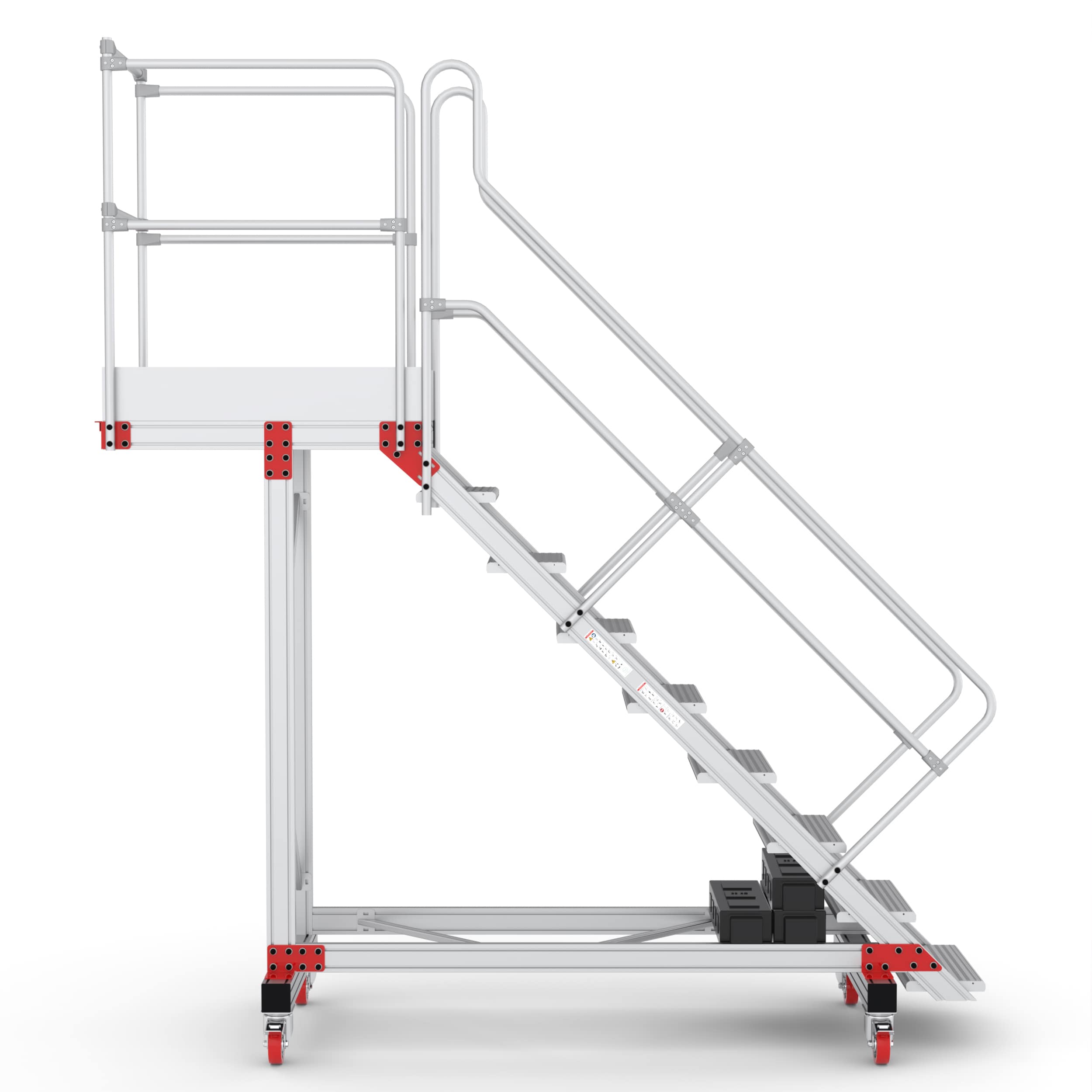 La plataforma de trabajo de 80 x 100 cm proporciona el espacio necesario para llevar a cabo las tareas de manera cómoda. Los peldaños amplios antideslizantes de 25 cm de ancho brindan una superficie de apoyo segura y visible, incluso en condiciones de baja visibilidad.