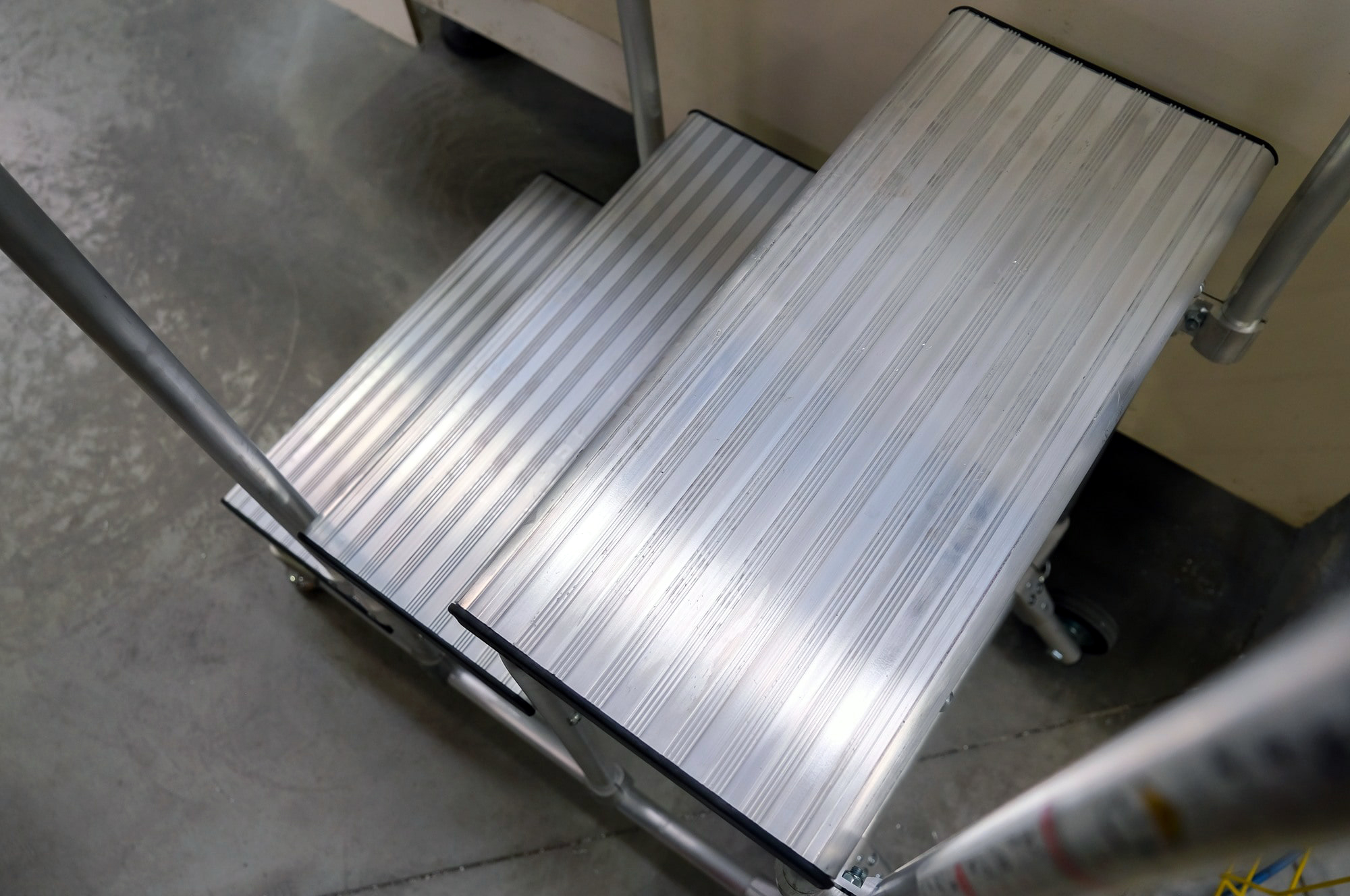 La plataforma de trabajo, fabricada en aluminio damero, es antideslizante y tiene una carga máxima de 150 kg, proporcionando un soporte seguro para tus tareas en altura. Plataforma de trabajo antideslizante de aluminio damero de 35×50 cm y peldaños de aluminio lambri de 34,5×50 cm.